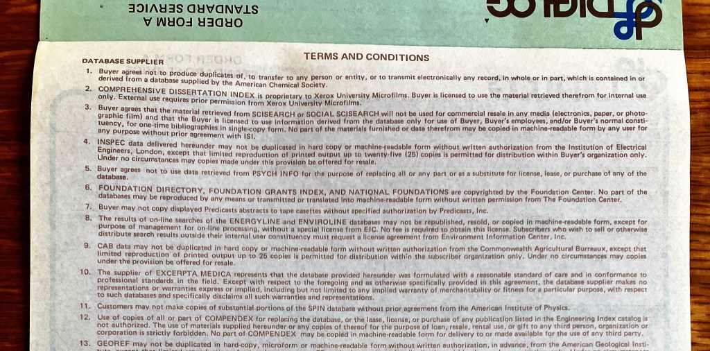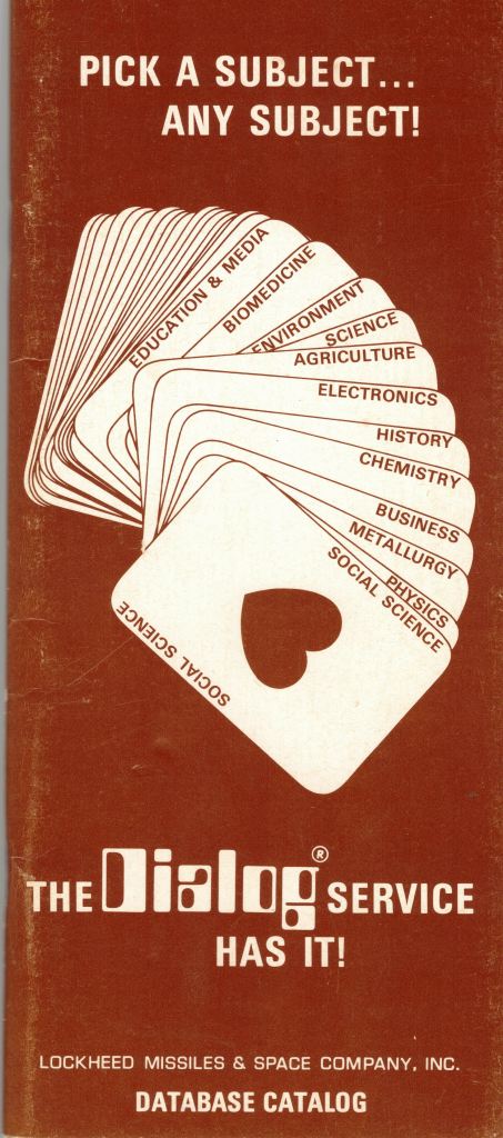 All of my initial assignments and projects led to deeper understanding of Dialog. These included two revisions of the Database Catalog (“Pick-a-Subject”), a new four-color brochure “Worldwide Information on Command,” and updating all of the database producer footnotes on “Order Form A” which was used to sign-up new customers.